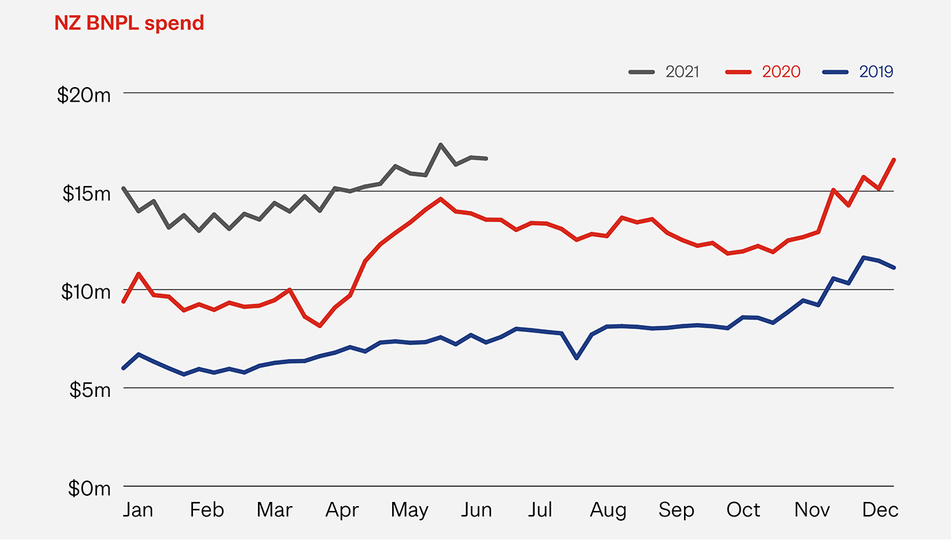 Following 72% growth in spend over 2020, BNPL continues to grow quarter on quarter in 2021. In the second quarter of 2021 (Q2 21) BNPL was 28% up on the same quarter in 2020 and a massive 121% up on the same quarter in 2019. That’s over $15m a week going through BNPL platforms, compared to around $7m in 2019. Around one in every five dollars being spent domestically online is through BNPL.
